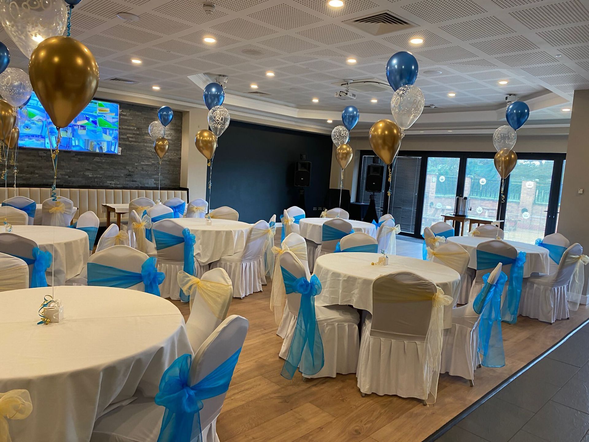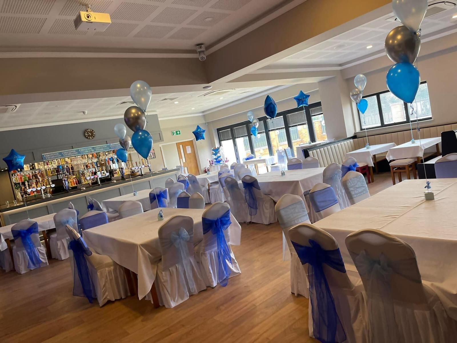 blue and white themed balloons