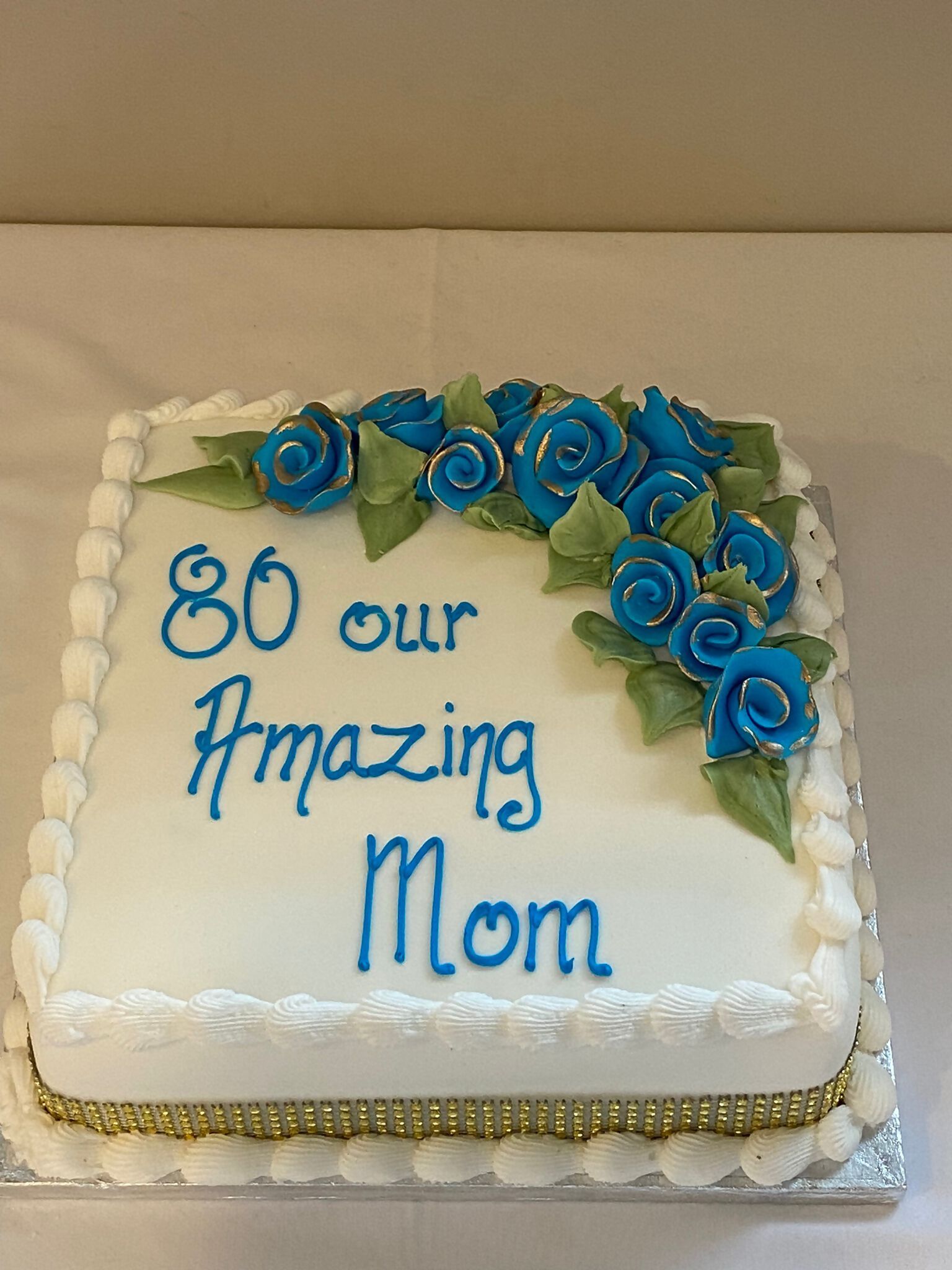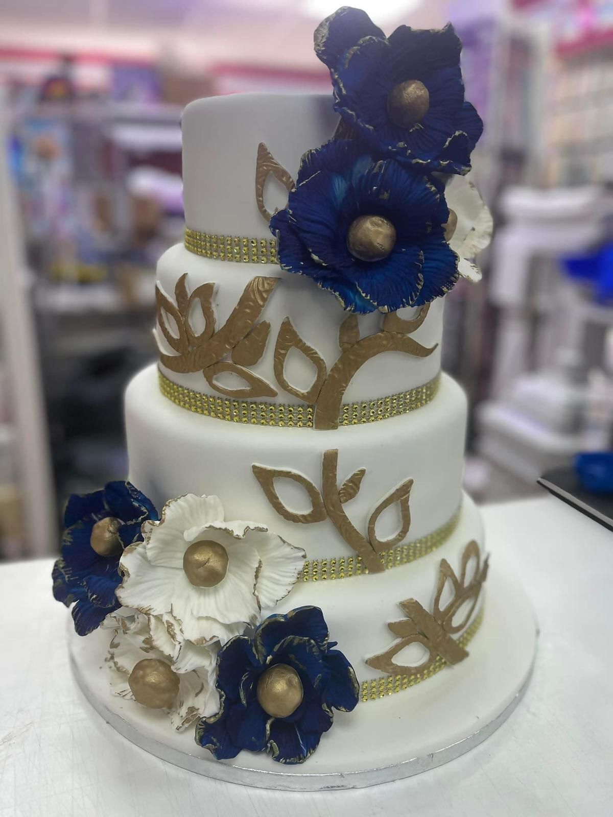 4 tier wedding cake with blue and white roses