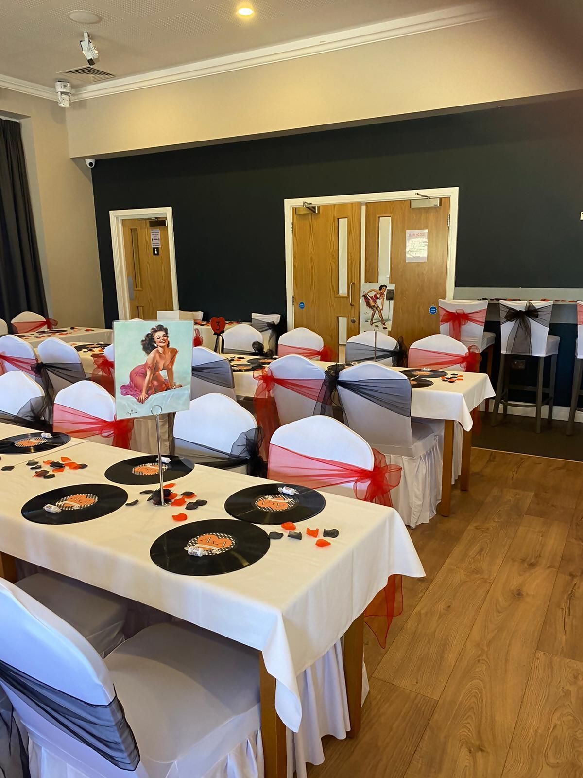table setting with chairs with red bows