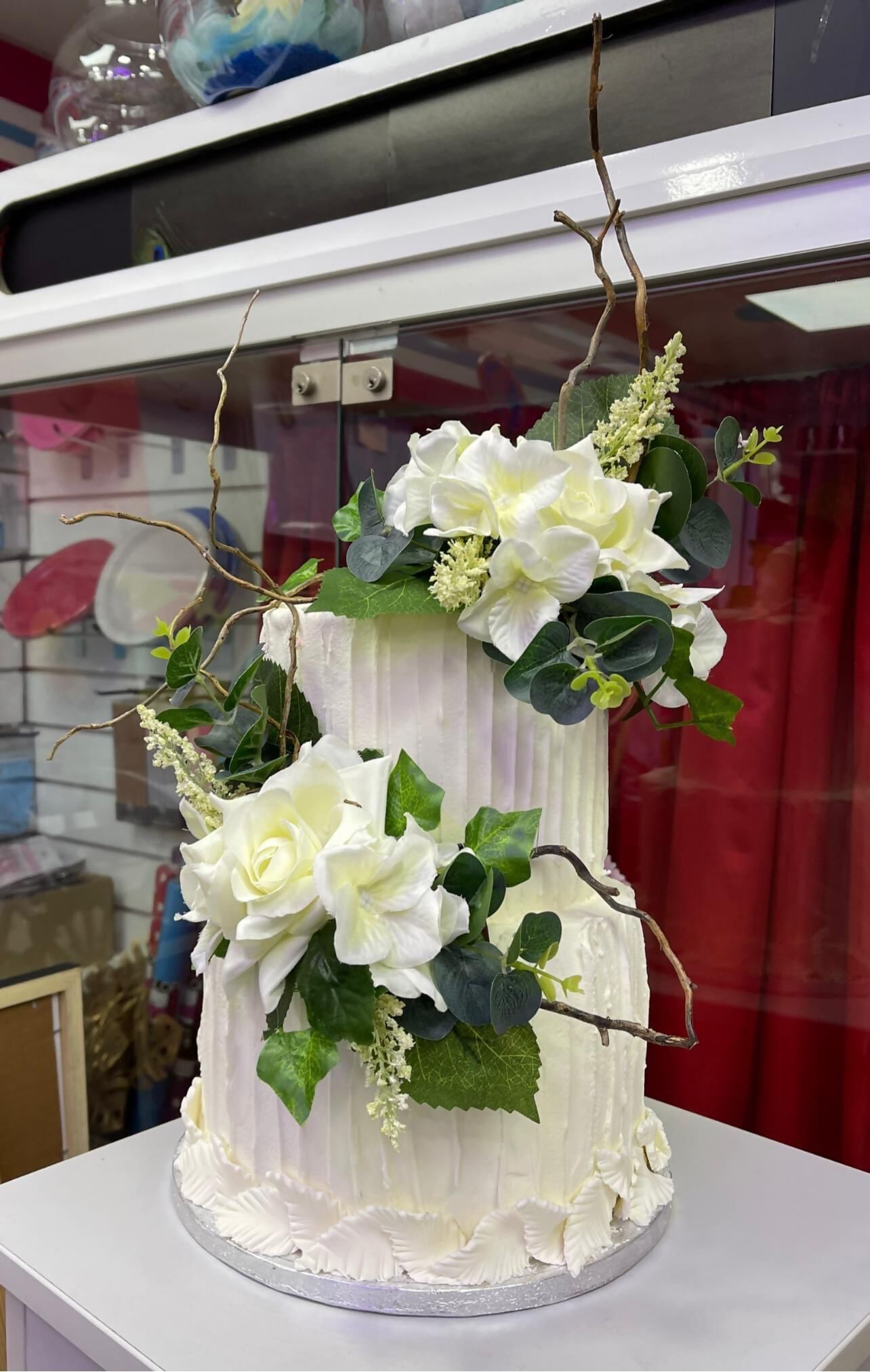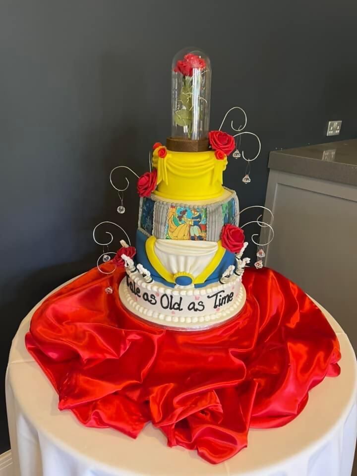 3 tier cake with red sash decoration