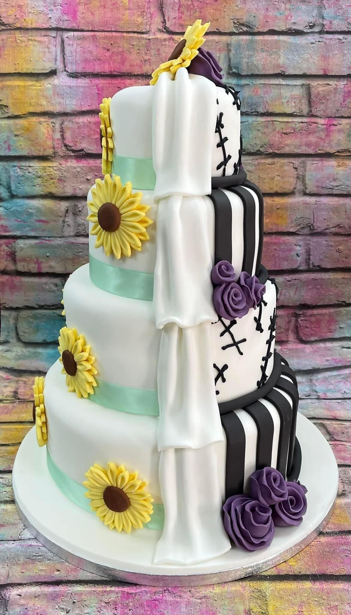 3 tier cake with yellow and purple roses