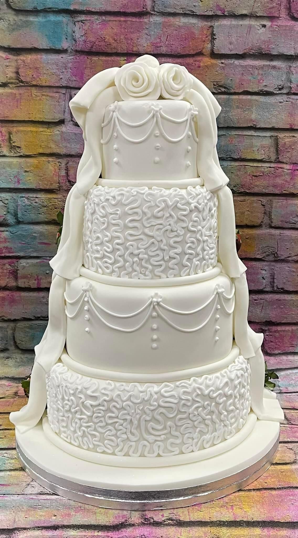 4 tier wedding cake with waterfall of roses
